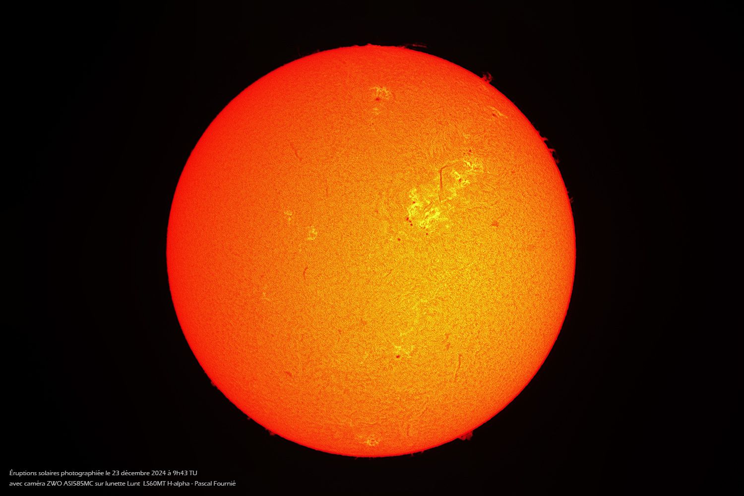 Durant l'observation, vous découvrirez les taches solaires, mais aussi toute l'activité à sa surface : éruptions solaires (protubérances), filaments, granulation. Pascal Fournié vous apportera des explications en utilisant un vocabulaire adapté à tous les publics.
